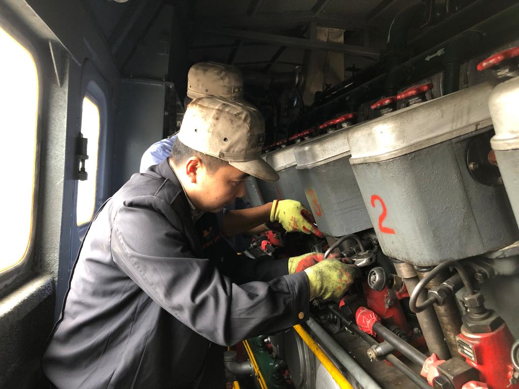 接到命令的他戴好頭燈、手套,拿上錘子、管鉗,立刻貓著身子鉆到了悶熱難耐的機(jī)車車底下。只見他一會(huì)兒用錘子使勁敲著,一會(huì)兒拿起管鉗用力卸著。幾分鐘的工夫,他的臉上就滲出了汗水,胳膊上沾滿了灰塵。