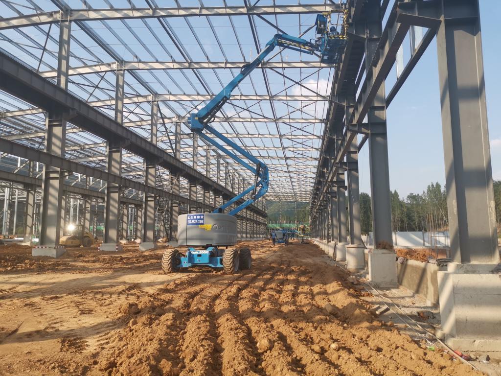在距離地面28米的高空作業(yè)現(xiàn)場,3名作業(yè)人員正在有條不紊的安裝廠房橫梁及檁條工作,地面上的無人駕駛特種曲臂車讓人眼前一亮。