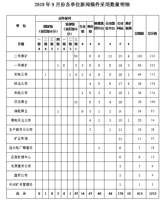 2019年9月份各單位新聞稿件采用數(shù)量明細(xì)