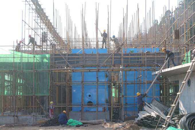 11月17日,筆者在污水處理廠施工現(xiàn)場(chǎng)看到,建筑工人三三兩兩穿梭在鋼筋密林里,或捆綁固定,或手工焊接,一片熱火朝天的景象;在綜合水處理車間,3名工人正忙著加工制作防護(hù)欄桿、金屬樓梯……
