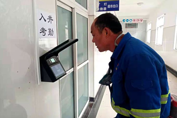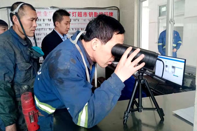 在雙龍煤業(yè)的考勤室外,即將要入井的該礦職工王濤第一天采用虹膜識(shí)別技術(shù)進(jìn)行考勤。