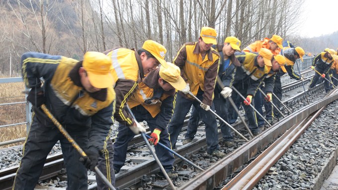 線路點多線長,進入冬季以來,氣溫下降,線路工們每天仍然堅持一大早就開始作業(yè)?!熬€路工工作非常辛苦,每天要背著幾斤甚至十幾斤的工具在工區(qū)內行走十幾公里,工作環(huán)境非常艱苦,冬天寒風刺骨,而他們一直要堅持到完成工作為止。他們辛苦地工作,就是為了消除安全隱患?!惫斩纹呃镦?zhèn)工區(qū)工長馬占明這樣說道。