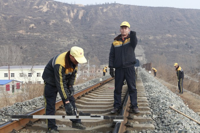 11月的橋山腳下,晝夜溫差大得像坐過山車。可在黃陵礦業(yè)鐵路專用線上,有這么一群人,頂著凜冽的寒風,穿著黃色工裝,腳踩道砟,蹲在線路中間,紅著的雙手拿著冰冷的鐵路道尺,一步步的緩緩地向前挪動著。每測量一次,就用石筆標記好數(shù)字并記錄著。