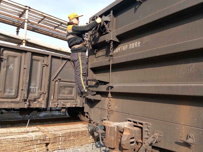 一次編車作業(yè)過程中,列車復(fù)檢完畢,正準(zhǔn)備發(fā)車,對講機(jī)聽到調(diào)車員匯報(bào):最后一位車輛人力制動機(jī)故障,無法撤除。這次遇見的人力制動機(jī)便是調(diào)車作業(yè)人員最頭疼的“盒子閘”,開關(guān)失效,鏈子卡死,但這次更特殊,盒子外側(cè)圓孔被鎖鏈堵死,調(diào)車員經(jīng)過多次嘗試處理,汗流浹背,還是沒有一點(diǎn)兒松動跡象,他聽到這種現(xiàn)象后,立刻趕赴故障現(xiàn)場,嘿嘿笑道:“小菜一碟!”上車掛好安全帶,使用小撬杠對盒子內(nèi)鏈條和齒輪進(jìn)行了一定的調(diào)整,反向用力轉(zhuǎn)動轉(zhuǎn)盤,再正向轉(zhuǎn)動,只聽見“咔嚓”一聲鏈子掉了下來,故障很快排除了。大家都向他豎起了大拇指,稱贊“能、能、能”!新設(shè)備和新技術(shù)應(yīng)用為調(diào)車一線注入了鮮活的血液,但新平面調(diào)設(shè)備出現(xiàn)了信號監(jiān)測提示音干擾或屏蔽語音信號,產(chǎn)生誤傳、漏傳現(xiàn)象,影響安全正確率,延誤作業(yè),他根據(jù)現(xiàn)場作業(yè)情況,很快發(fā)現(xiàn)是信號提示檢測音時(shí)間間隔太短造成的,建議由設(shè)備廠家技術(shù)人員將間隔時(shí)間由3秒調(diào)整為5秒,在作業(yè)中經(jīng)過不斷測試,既不影響設(shè)備的安全監(jiān)測,又保障了語音傳輸暢通,并在全公司推廣調(diào)整,使調(diào)車工作更加安全高效。
