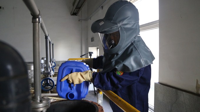 正午12:00,冬日的暖陽讓人覺得這是一天中最舒適的時刻,加藥間里,化水車間水質(zhì)化驗員潘麗萍和曹莉正按照車間制定的化學(xué)加藥“5F”管理法將一桶重25KG、型號為MDC772的阻垢劑倒入加藥罐中,莫看曹莉是一名纖瘦的女子,這25KG的一桶阻垢劑在她手中竟也是輕松地提起,大有一副“巾幗不讓須眉”的架勢, 她告訴筆者,這阻垢劑是根據(jù)液位的變化每隔2、3天加一次,每次加入量為75 KG,由于原水的水質(zhì)較硬,堿度高,所以這樣的阻垢劑必須按時按量進(jìn)行添加,否則將加速鍋爐管道的結(jié)垢磨損、腐蝕。 為了機組安全穩(wěn)定運行,在她們身上褪去了女性本有的柔弱,變身“女漢子”。