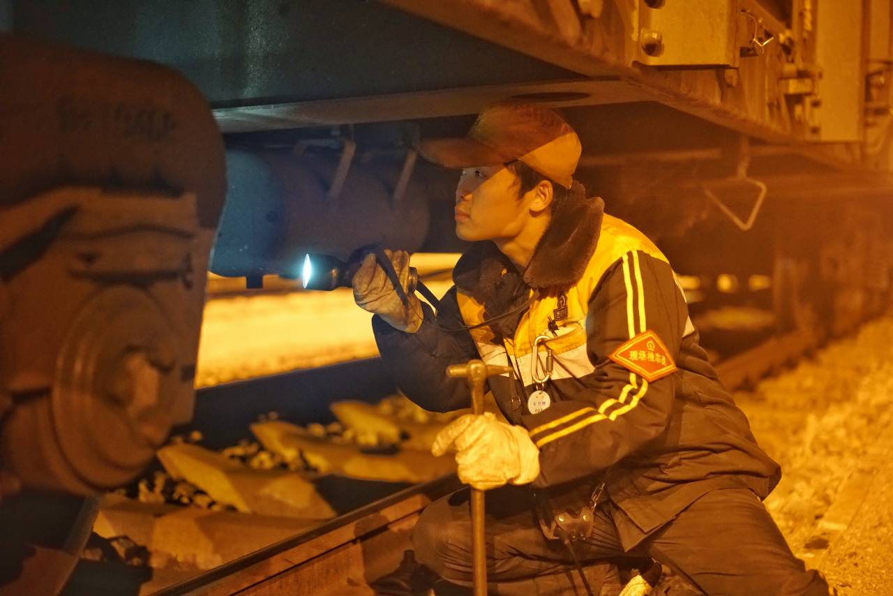 20分鐘后,楊清帶領(lǐng)8名檢車員直奔作業(yè)現(xiàn)場(chǎng)。在設(shè)置好防護(hù)信號(hào)后,檢車員孟凱拿起手電筒、檢車錘等工具,和工友們一起貓著身子,鉆進(jìn)了列車底部不足30平方米的昏暗空間里,時(shí)而彎腰弓背,時(shí)而抬頭側(cè)瞄。順著電筒光的反射,縱橫交錯(cuò)的管線、密布的螺栓,都在孟凱如炬的“鷹眼”里一一掃描。天氣雖冷,但大家干勁兒不減,看部位、敲配件,嚴(yán)格執(zhí)行著作業(yè)標(biāo)準(zhǔn)。那些忙碌的身影精神飽滿地奔走在一列列整裝待發(fā)的列車旁,他們敲下的每一錘都是對(duì)安全最好的承諾。