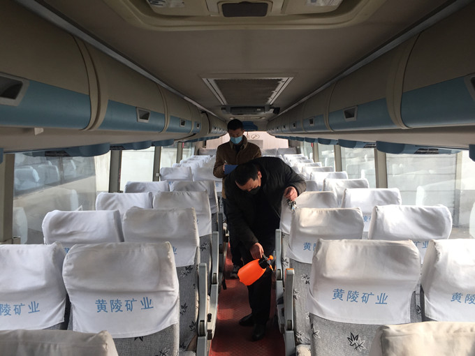 接送職工的大巴車要嚴(yán)格消毒,每位職工上車前都要測量體溫;