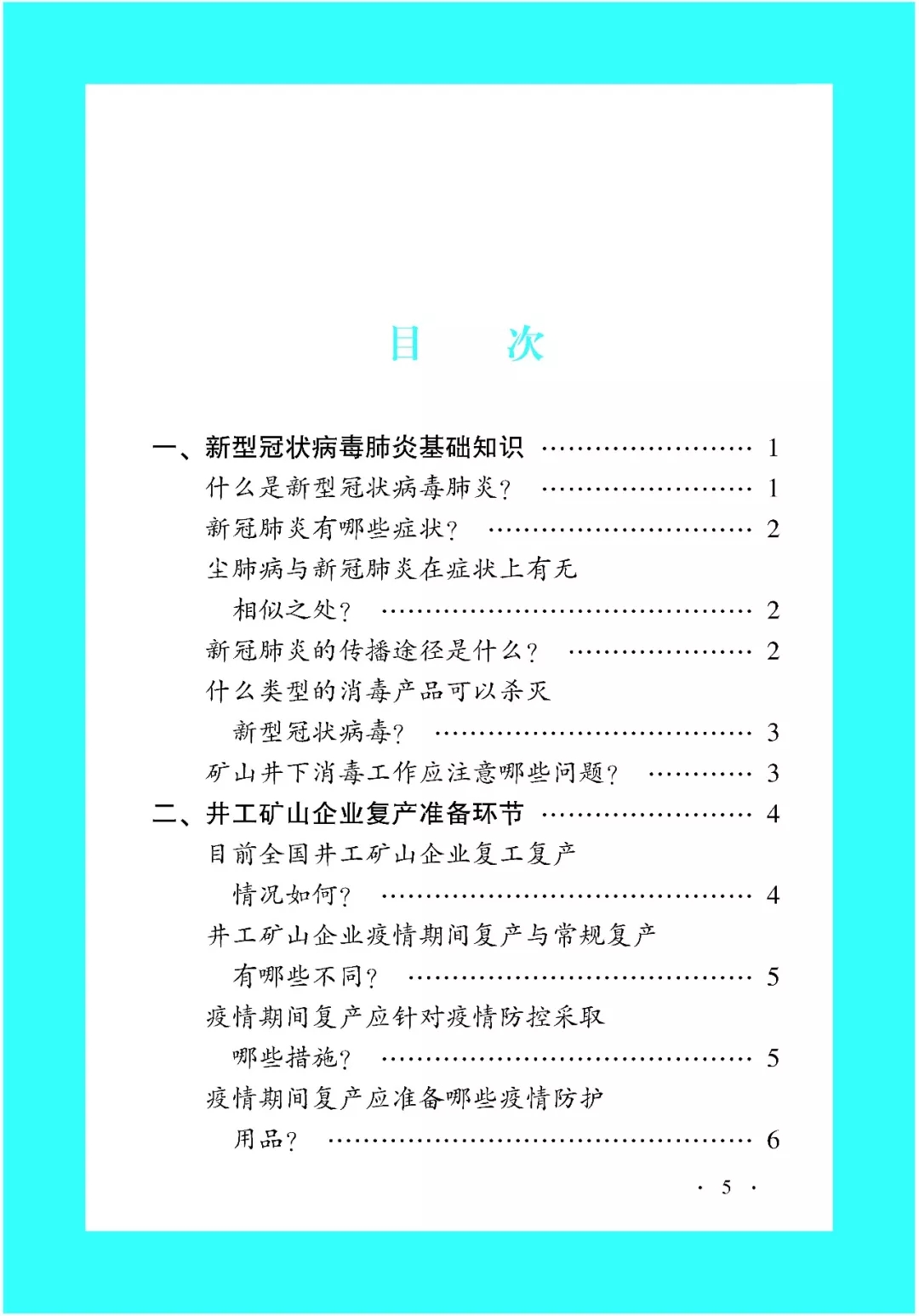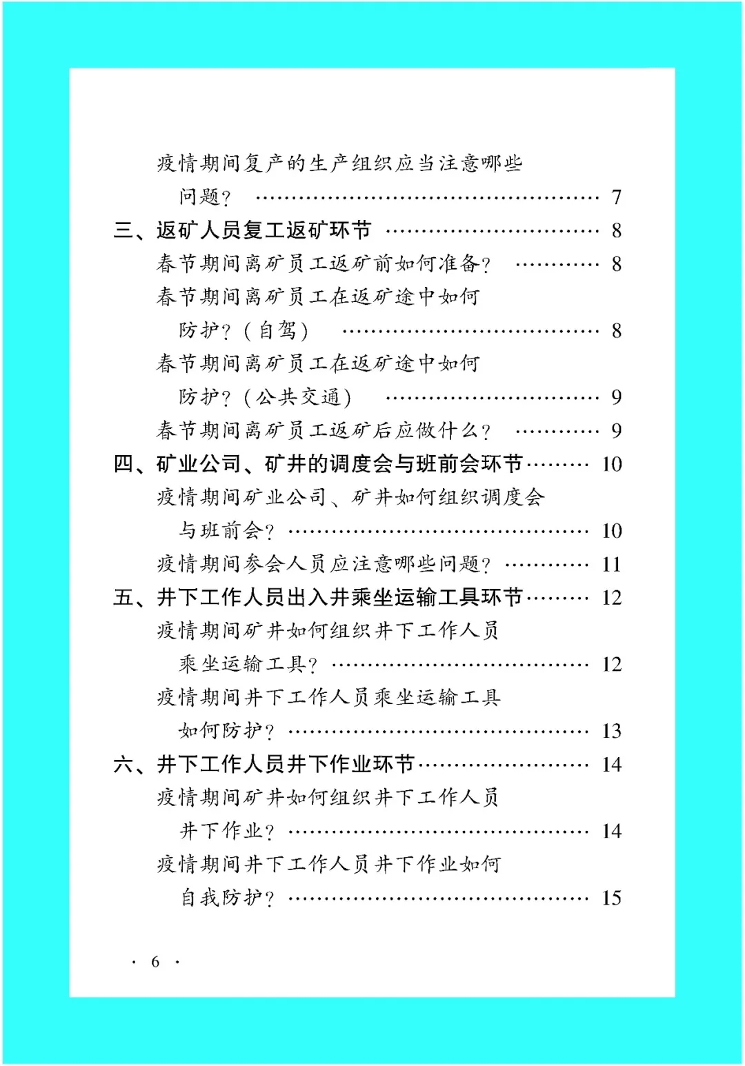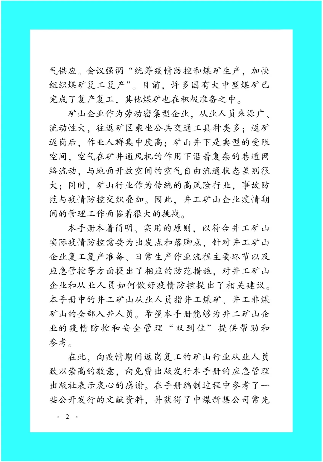 本手冊(cè)本著簡(jiǎn)明、實(shí)用的原則,以符合井工礦山實(shí)際疫情防控需要為出發(fā)點(diǎn)和落腳點(diǎn),針對(duì)井工礦山企業(yè)復(fù)工復(fù)產(chǎn)準(zhǔn)備、日常生產(chǎn)作業(yè)流程主要環(huán)節(jié)以及應(yīng)急管控等方面提出了相應(yīng)的防范措施,對(duì)井工礦山企業(yè)和從業(yè)人員如何做好疫情防控提出了相關(guān)建議。