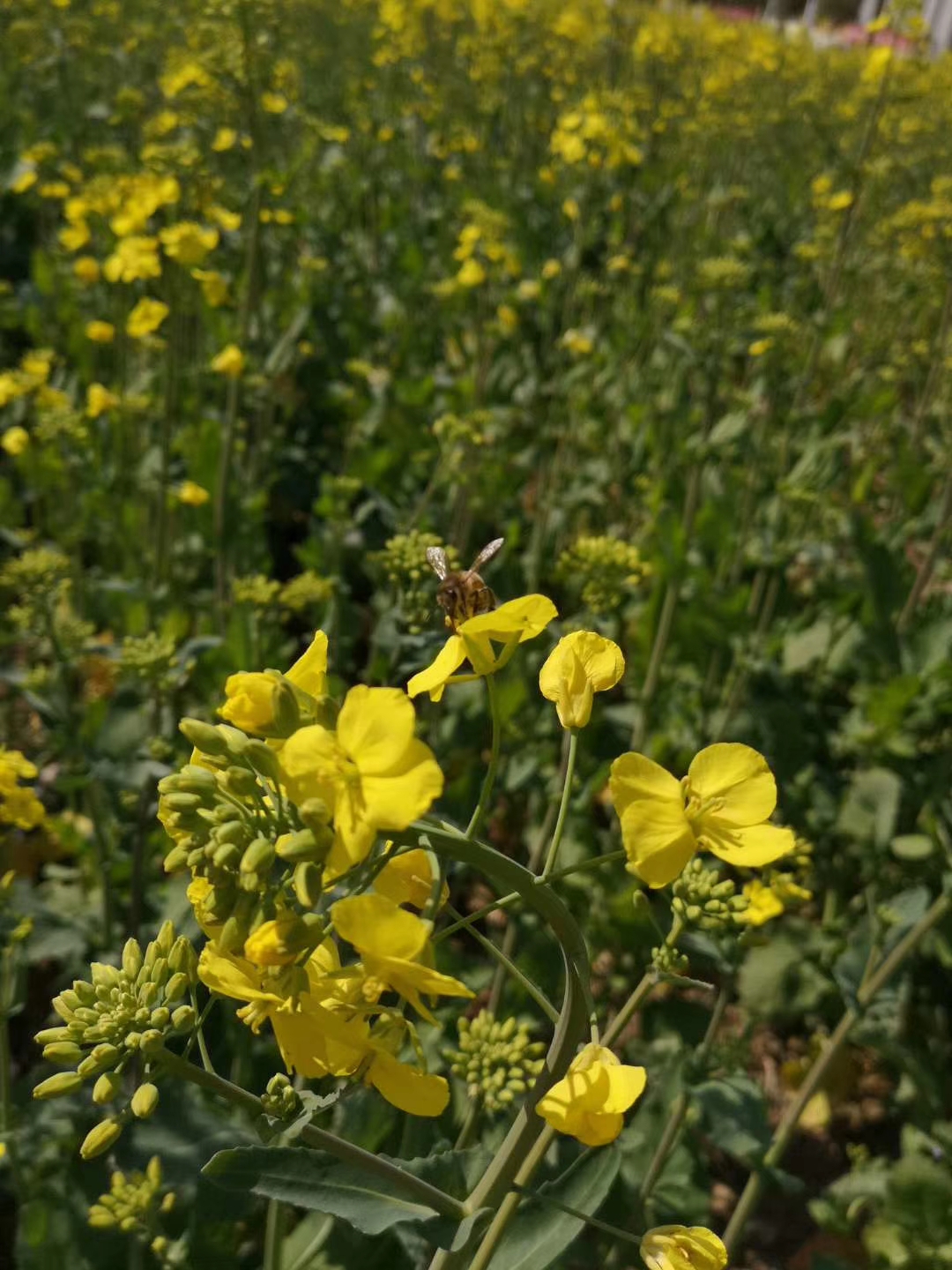 油菜花開滿地黃,叢間蝶舞蜜蜂忙