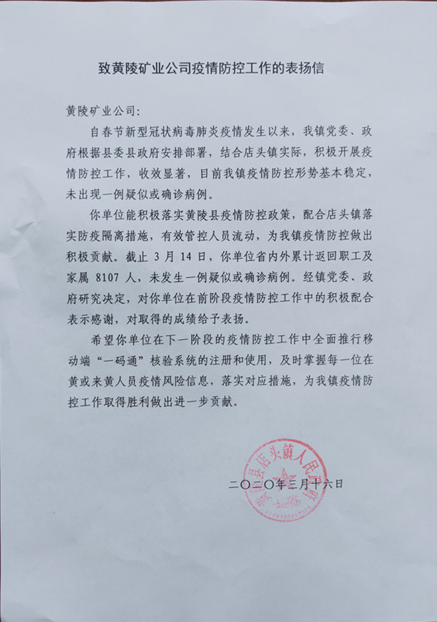 近日,公司收到黃陵縣人民政府和和店頭鎮(zhèn)人民政府發(fā)來的表揚信。信中對黃陵礦業(yè)公司在前一階段的疫情防控工作表示衷心感謝,并提出表揚。