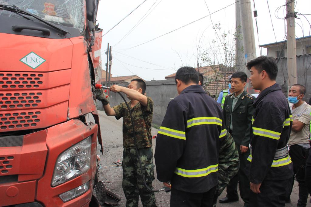 5月5日,在應急救援中心雙龍基地大門口,上演了英勇救援的一幕。早11點左右,兩輛裝滿煤的紅色大卡車因在拐彎處會車發(fā)生嚴重交通事故,受傷司機被擠變形的駕駛室擠壓到腿部,方向盤緊壓在司機的胸部,司機意識清晰但無法挪動。