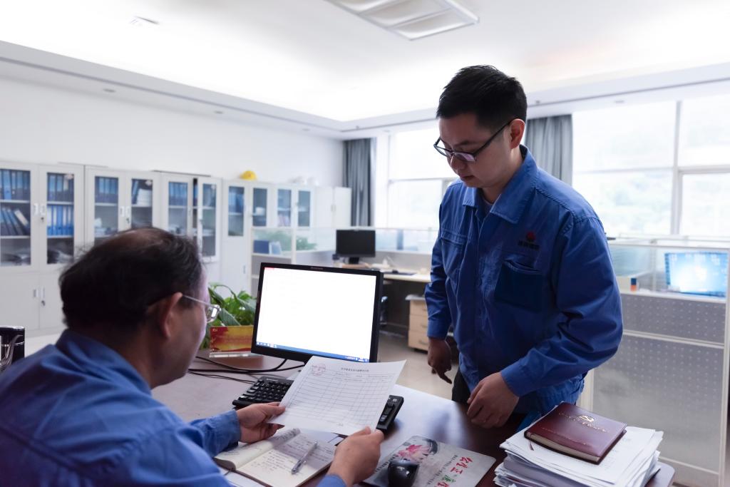 16:30完成隱患整改驗(yàn)收和作業(yè)現(xiàn)場(chǎng)隱患排查后,梅睿回到辦公室,作為發(fā)電公司NOSA安健環(huán)管理體系中的元素負(fù)責(zé)人之一,他還要協(xié)調(diào)處理NOSA區(qū)域代表上報(bào)的隱患,并按相關(guān)標(biāo)準(zhǔn)進(jìn)行隱患整改驗(yàn)收,同時(shí),梅睿還要進(jìn)行整理每周安全教育培訓(xùn)及每月安全生產(chǎn)工作例會(huì)會(huì)議紀(jì)要、統(tǒng)計(jì)安全生產(chǎn)費(fèi)用、接收處理上級(jí)部門(mén)安全來(lái)文等內(nèi)業(yè)工作。圖為梅睿正在將部門(mén)安全隱患整改回執(zhí)交給部門(mén)負(fù)責(zé)人進(jìn)行審批。