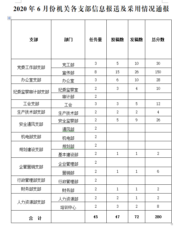 2020年6月份機(jī)關(guān)各支部信息報(bào)送及采用情況通報(bào)