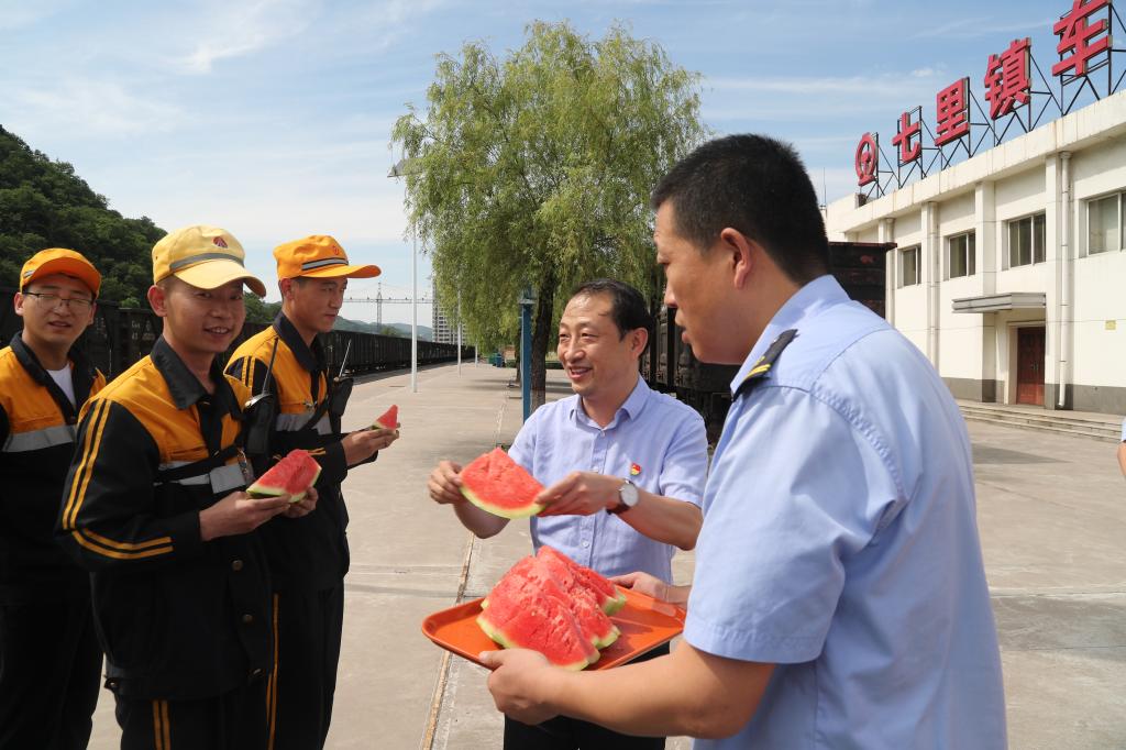“大家辛苦了,天熱干活一定要注意安全。”在鐵運(yùn)公司七里鎮(zhèn)車站,孫鵬為現(xiàn)場(chǎng)工作人員送上飲料、菊花、茶葉、西瓜等防暑降溫用品,并詳細(xì)詢問了工作人員夏季調(diào)車作業(yè)、機(jī)車降溫設(shè)備運(yùn)行狀態(tài),細(xì)致了解了職工們工作生活情況,囑咐大家要牢固樹立安全意識(shí),勞逸結(jié)合,確保高溫季節(jié)人身安全。