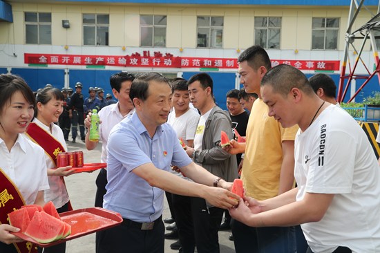 在二號(hào)煤礦運(yùn)輸隊(duì)大院,正值工人入井高峰期,一輛輛無軌膠輪車像等待檢閱的列兵一樣整齊的排列著。孫鵬將防暑降溫物品送到司機(jī)手中,囑咐他們一定要注意安全,按章作業(yè),做好車輛日常維護(hù)保養(yǎng),確保礦井運(yùn)輸安全。同時(shí)要求二號(hào)煤礦黨政負(fù)責(zé)人要積極為職工提供有利的防暑降溫條件,保證職工身體健康,保證礦井生產(chǎn)安全。
