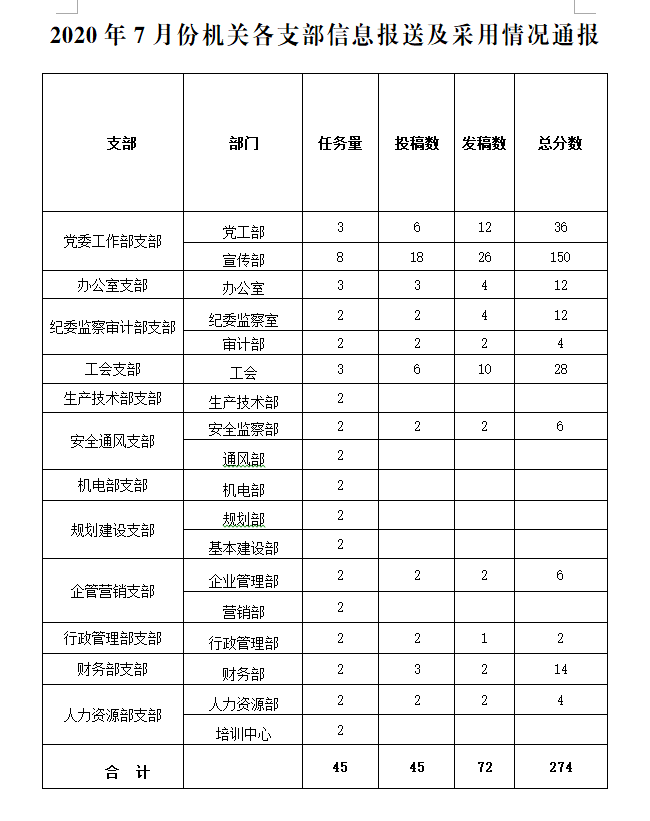 2020年7月份機(jī)關(guān)各支部信息報(bào)送及采用情況通報(bào)