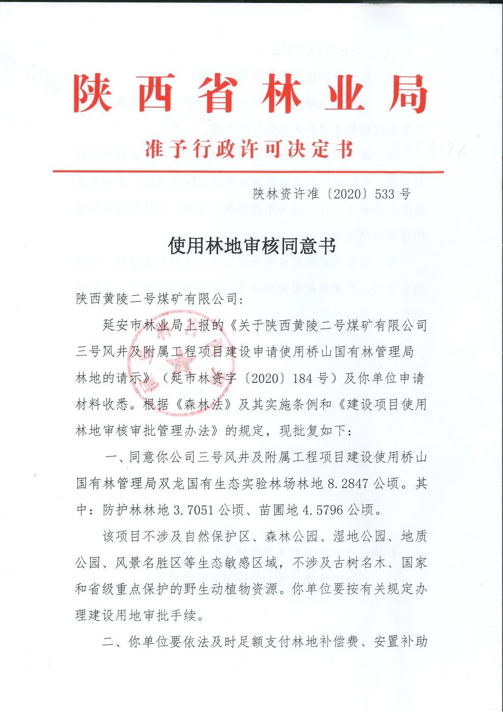 近日,從陜西省林業(yè)局傳來喜訊,二號煤礦三號風井及附屬工程項目建設(shè)使用林地請示獲得陜西省林業(yè)局審核同意(陜林資許準〔2020〕533號)。
