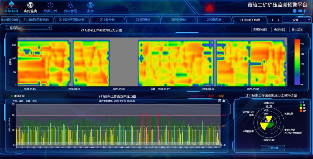 “平臺可以采集工作面礦壓數(shù)據(jù),計算分析出工作面頂板初撐力、液壓支架工作阻力分布比例、安全閥開啟比例、高報比例等,出現(xiàn)異常數(shù)據(jù)及時報警?!痹谠摰V調(diào)度指揮中心的電腦控制端,韓嘉琦指著顯示屏上的橙紅綠相間的模擬云圖介紹,紅色區(qū)域代表高壓區(qū)、綠色區(qū)域代表低壓區(qū)、橫坐標代表時間、縱坐標代表工作面支架號。