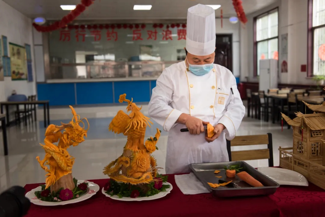 在用餐桌臨時(shí)搭建的操作臺(tái)上,瑞能煤業(yè)職工餐廳的廚師李小峰正全神貫注的盯著手中的刻刀,一點(diǎn)點(diǎn)的在食材上龍飛鳳舞的操作著。不到三分鐘,用南瓜雕刻的鳳冠就栩栩如生的展示在眾人面前,現(xiàn)場想起了熱烈的掌聲。