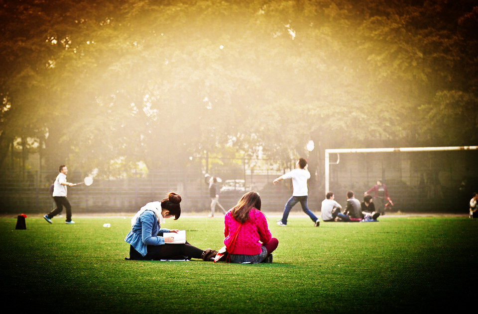 不用上班的周末,人也慵懶了幾分,舒緩地收拾好家務,穿著不薄不厚的秋裝,休閑地走在文體中心松軟的草坪上,柔和的太陽烤在身上,讓人覺得增一度則太熱,減一度則太冷,如沐溫泉的愜意,是從皮膚到五臟六腑的通透;此刻,可以心無旁騖,不想要做的工作,不想已有的煩惱,或躺在草坪上,或坐在椅子上,任太陽把自己曬個夠,烤個透,哪怕是汗珠如雨,只為享受這一刻的驕陽。