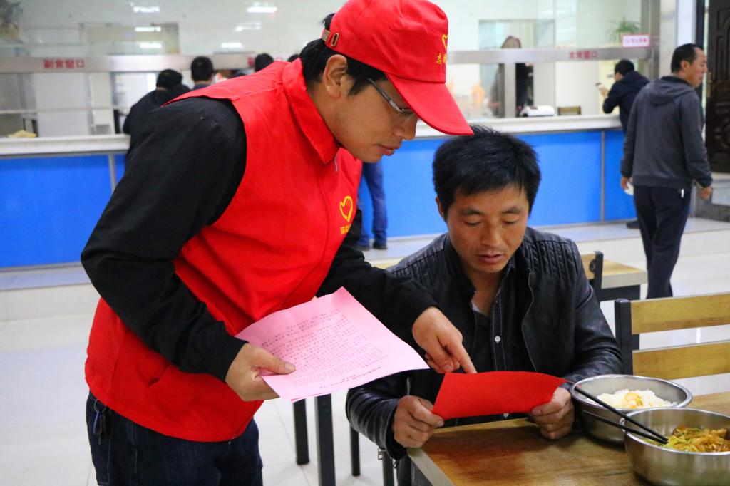 “師傅您好,現(xiàn)在從上到下都在講‘光盤’,就是要倡導大家發(fā)揚我們中華民族的勤儉節(jié)約優(yōu)良傳統(tǒng),能吃多少就買多少,咱們堅決不浪費一粒糧食?!鼻嗄曛驹刚咝》株犝谙蚓筒吐毠みM行著“光盤行動”的宣傳引導。