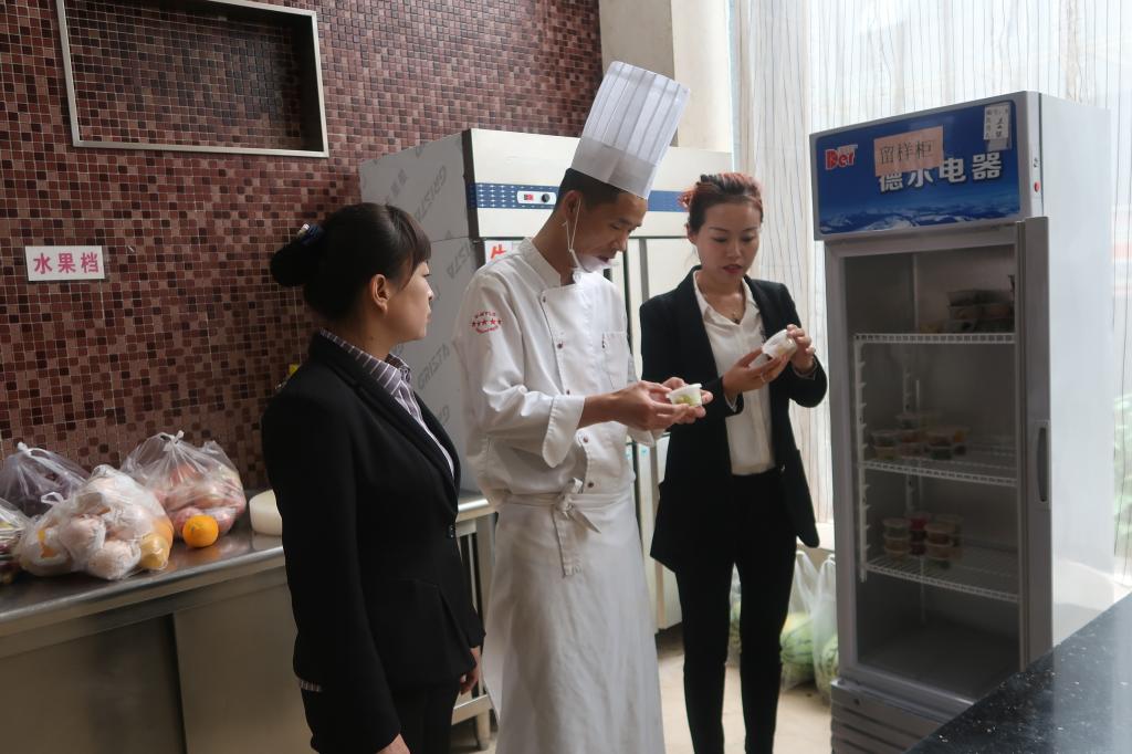 “不符合標準的原材料堅決不入庫,同時加強后廚人員、設施設備、食品加工全過程管控,劃分責任區(qū),落實到人,做到食品加工過程有監(jiān)控,隨時‘掌控’操作間食品安全。嚴格審查后廚人員的健康狀態(tài),懸掛本人健康證,設施設備清潔有記錄,雙管齊下確保食品安全?!痹谑称钒踩珜m棛z查部署會上礦業(yè)賓館黨支部書記黃紅俠強調(diào)。