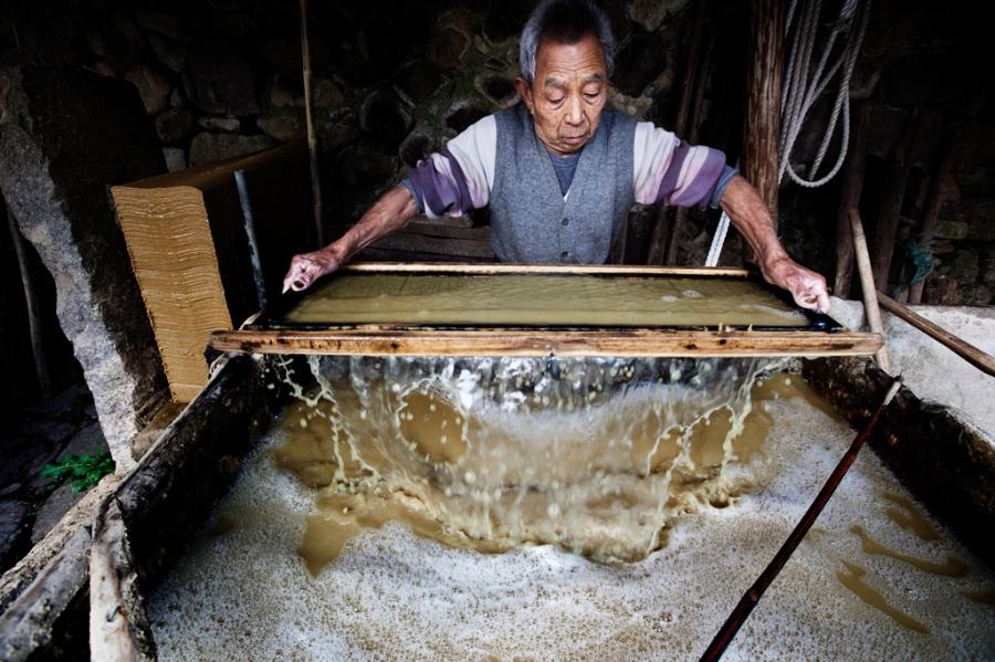 陰干后的紙料再次入鍋蒸后進行漂洗、晾干,撿去里面的雜質(zhì)后捆成捆,固定到一個專用的木凳子上,用大刀片切碎后用布包包好,再過一遍清水后方可以進入紙池,在紙池里與水混合在一起形成紙漿后進行撈紙。