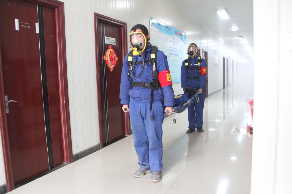 各演練小組積極響應(yīng),滅火組迅速利用滅火器和消防水進行滅火。只見濃煙滾滾中,幾名職工快速彎腰用濕衣服或毛巾捂住口鼻,扶墻尋找“安全出口”,1分零6秒邊后,辦公樓人員撤離“火災(zāi)現(xiàn)場”并報告現(xiàn)場有人員受傷被困,應(yīng)急救援組迅速穿戴正壓式空氣呼吸器,手提擔(dān)架和滅火器沖入現(xiàn)場,及時將被困人員救出,醫(yī)療救護組立即展開心肺復(fù)蘇和人工呼吸急救……