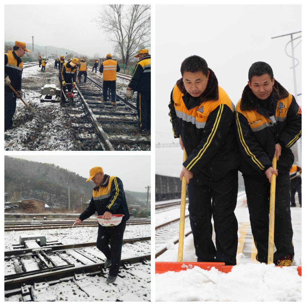 鐵運(yùn)公司“以雪為令”,緊急啟動(dòng)冬季特殊天氣應(yīng)急預(yù)案,車、工、電等部門從人、機(jī)、物等方面相互協(xié)作、相互配合,緊急出動(dòng)。在線路上,為確保道岔設(shè)備狀態(tài)良好,車務(wù)段根據(jù)雪情及時(shí)組織掃雪人員上崗,清掃道岔積雪。在對(duì)道岔進(jìn)行除雪時(shí)由現(xiàn)場防護(hù)員與信號(hào)樓聯(lián)絡(luò)員時(shí)時(shí)聯(lián)控,確保了道岔轉(zhuǎn)動(dòng)或有機(jī)車通過時(shí)除雪人員的安全和暴風(fēng)雪天氣整備作業(yè)秩序。在各個(gè)段站,大家積極主動(dòng)、相互配合、齊心協(xié)力,揮舞著鐵鍬和笤帚,你鏟我掃,同時(shí)不忘在厚厚的冰上撒鹽。風(fēng)在吹,雪在下,職工在行動(dòng),只見道岔上的積雪越來越少,露出了它們?cè)械慕饘偕珴?。而職工們卻是一身“白衣”。為了確保運(yùn)輸安全,除雪工作依然熱火朝天。