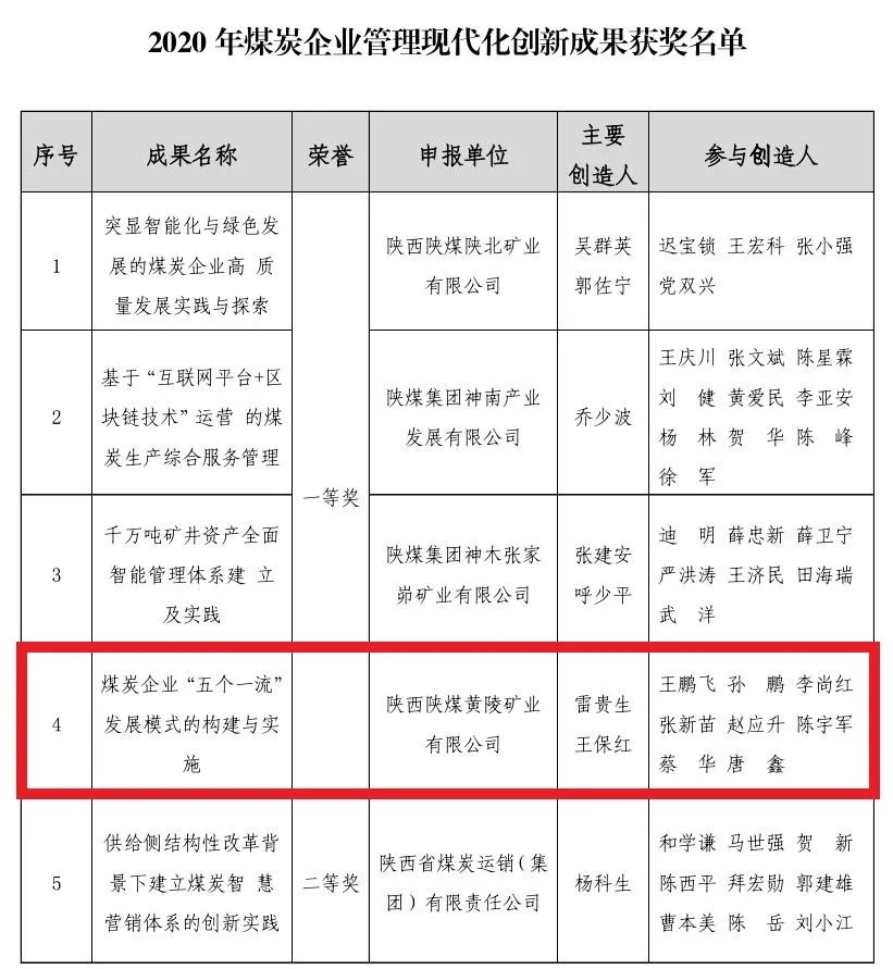 日前,公司《煤炭企業(yè)“五個(gè)一流”發(fā)展模式的構(gòu)建與實(shí)施》榮獲中國煤炭工業(yè)協(xié)會“2020年煤炭企業(yè)管理現(xiàn)代化創(chuàng)新成果一等獎(jiǎng)”。
