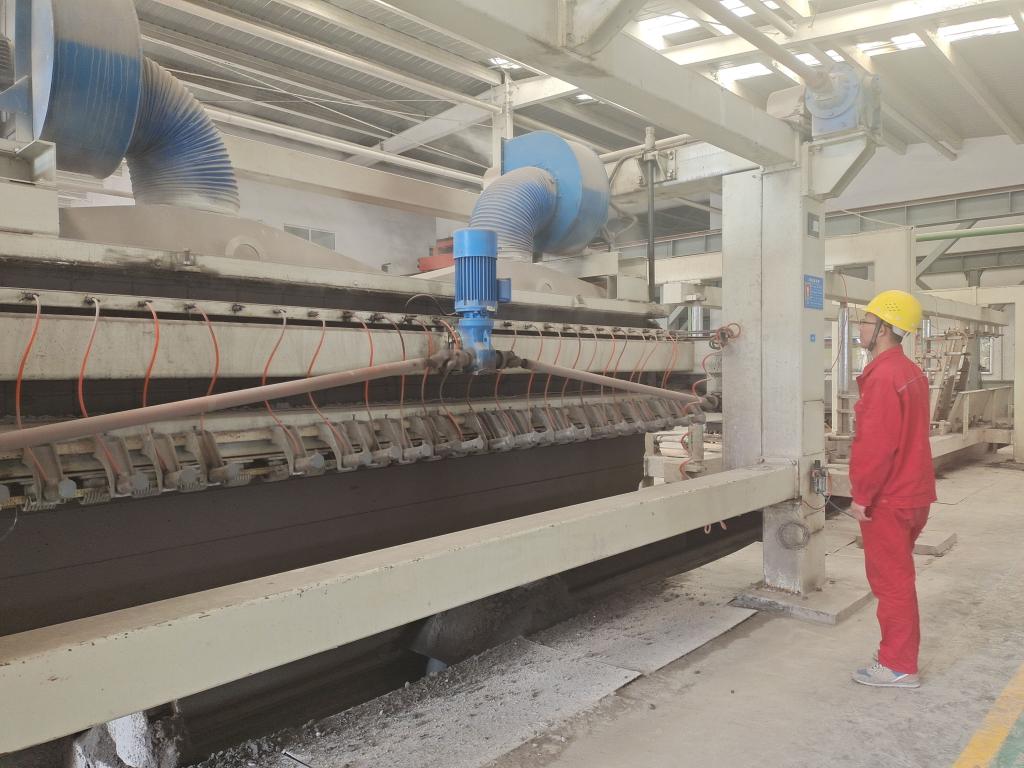 班前會結(jié)束后,切割機(jī)操作工秦毛小來到集控室,開始仔細(xì)監(jiān)測“配料系統(tǒng)”的加水量、溫度、干料計(jì)量等數(shù)據(jù),而集控室操作員陳虎剛則在切割機(jī)旁忙碌的工作著。