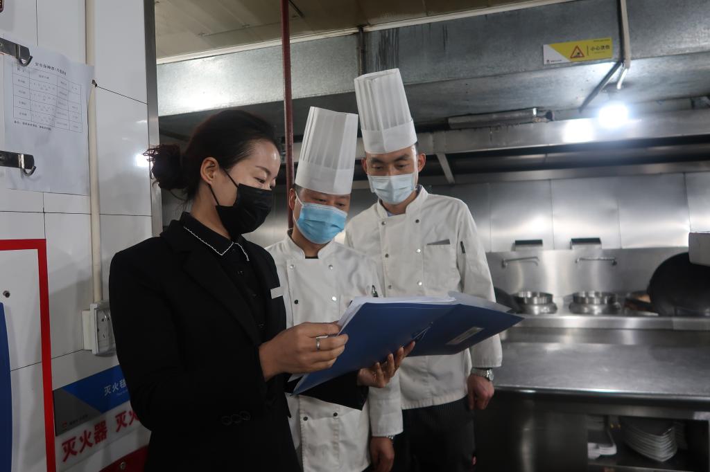 礦業(yè)賓館的入口處張貼了“健康碼”,所有人員進(jìn)入大廳必須佩戴口罩、掃碼、測(cè)體溫,每日入住人員必須做好登記,各個(gè)區(qū)域的衛(wèi)生消毒臺(tái)賬和防疫安全臺(tái)賬都井然有序、記錄規(guī)范。隨后,檢查組針對(duì)后廚的食品衛(wèi)生、地面、收碗臺(tái)、泔水桶、門窗玻璃、防蠅設(shè)施是否符合規(guī)范,手持滅火器是否能正常使用,電器插座插頭是否完好、運(yùn)作是否正常,廚房用火有無安全隱患,廚房工作人員在崗是否違規(guī)吸煙等多方面進(jìn)行檢查。