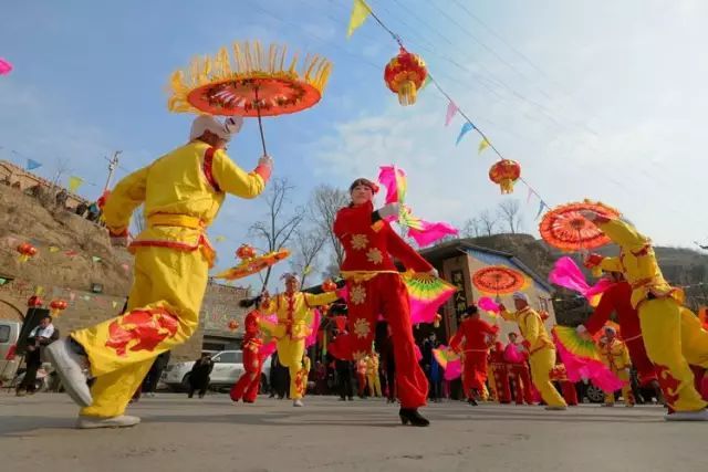 鬧秧歌拜年是陜北年俗中獨(dú)特的風(fēng)情。春節(jié)期間,村村都組織秧歌隊,挨門逐戶拜年,在這里俗稱“排門子”。秧歌拜年首先是謁廟、敬神,祈禱一年風(fēng)調(diào)雨順五谷豐登,然后到各家各戶拜年。排到誰家,誰家就要認(rèn)真的準(zhǔn)備一番,酒、香煙、瓜子、水果糖,見人就要遞,秧歌隊每到一戶,傘頭即興創(chuàng)作自編唱詞向主人祝福。如“進(jìn)了大門抬頭看,六孔石窯齊展展,五谷豐登人興旺,一年四季保平安?!币贿吺谴謇雉[秧歌的,一邊是家家的小展覽,看得人眼花繚亂。