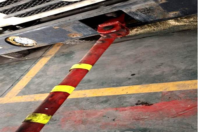 該礦輔助運(yùn)輸主要依托無(wú)軌膠輪車(chē),在井下工作時(shí),因各種原因?qū)е聼o(wú)軌膠輪車(chē)出現(xiàn)故障,無(wú)法移動(dòng)時(shí),便需要另一輛車(chē)輛對(duì)其進(jìn)行拖離,但因井下環(huán)境條件限制,使用繩索類(lèi)拖車(chē)工具進(jìn)行拖離時(shí),不僅存在繩索斷裂帶來(lái)的安全隱患,在拖車(chē)過(guò)程中,拐彎時(shí)也多有不便,如遇特殊情況前車(chē)需要緊急制動(dòng),后車(chē)如剎車(chē)系統(tǒng)出現(xiàn)故障,則會(huì)發(fā)生車(chē)輛碰撞,不僅損壞車(chē)輛,還會(huì)對(duì)車(chē)輛駕駛?cè)思案浇O(shè)備造成一定的安全威脅。