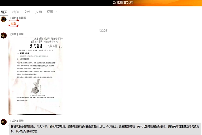 “受低渦影響,17至20日我省將迎來(lái)一場(chǎng)降水,其中榆林南部、延安局部地區(qū)將有短時(shí)暴雨或雷雨大風(fēng),請(qǐng)以上地區(qū)做好防范?!痹陔p龍煤業(yè),一旦有降水預(yù)報(bào),調(diào)度員便第一時(shí)間將預(yù)報(bào)通知到各單位,提醒全礦做好應(yīng)對(duì),以防降雨對(duì)生產(chǎn)帶來(lái)影響。