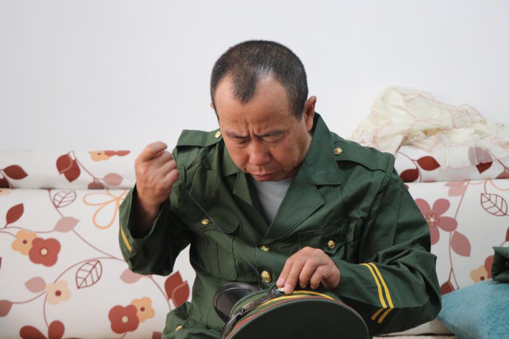 我在收拾相機(jī)的時候,老喬在整理他的軍帽。由于年代久遠(yuǎn),帽帶已經(jīng)脫落,老喬不知從哪找出針線來,一針一針縫了起來,一身軍裝,一張不再年輕的臉,低頭嚴(yán)肅地縫補(bǔ)著,多好的一個畫面。于是我將本已收回的相機(jī)取出,定格了這充滿濃郁軍旅情的畫面。