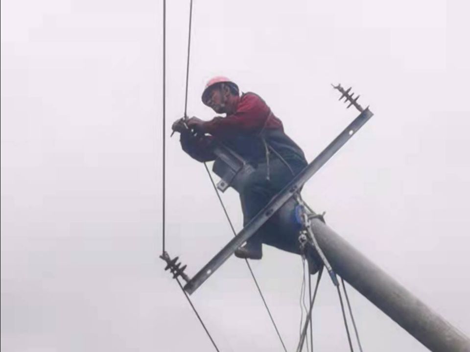 “電線桿淋濕,易打滑,大家一定踩實踏板?!崩詈陝傄贿叾谥蠹?,一邊開始爬桿,50多歲的他麻利的爬到桿頂,熟練地裝起橫擔、絕緣子。