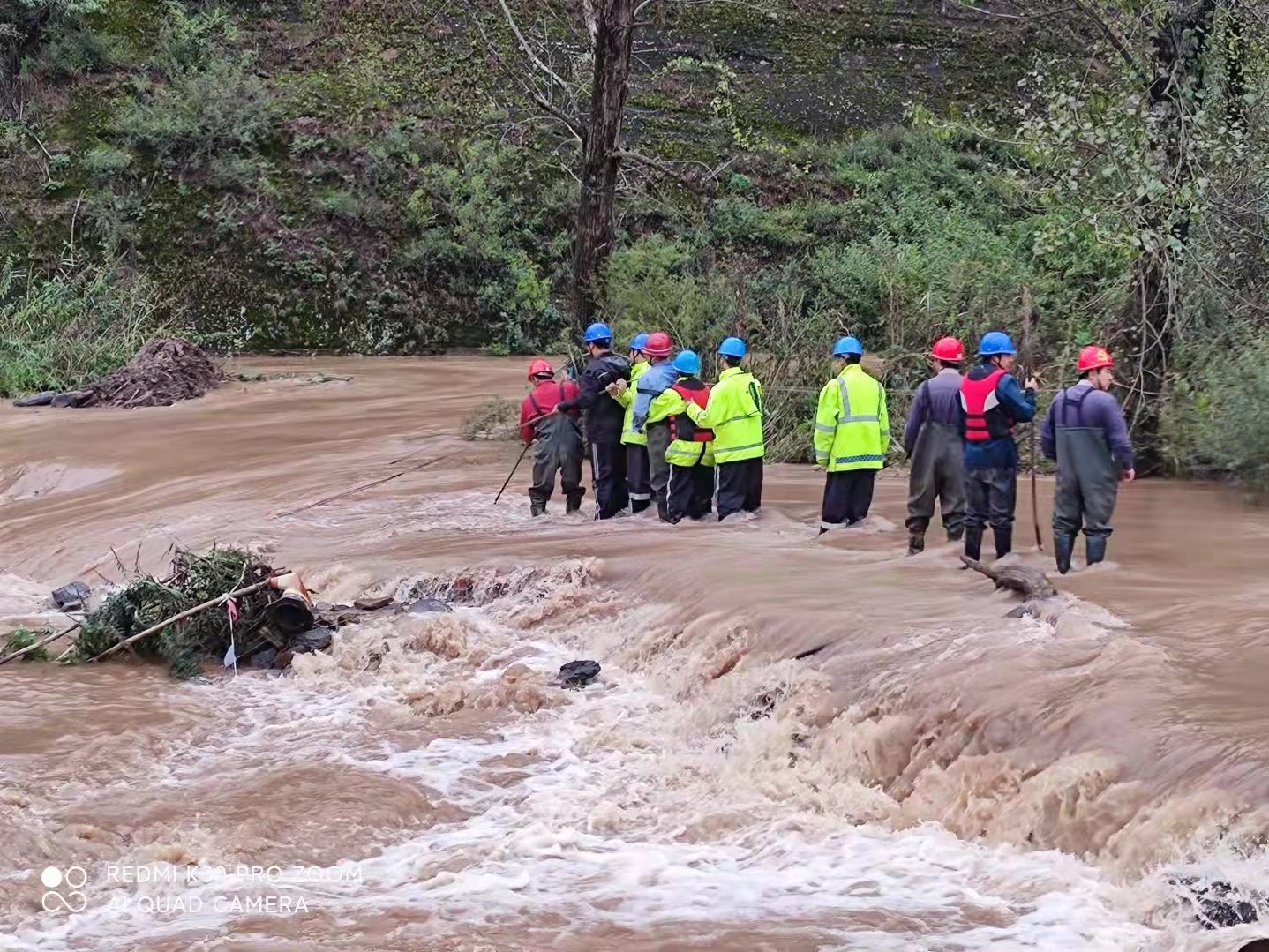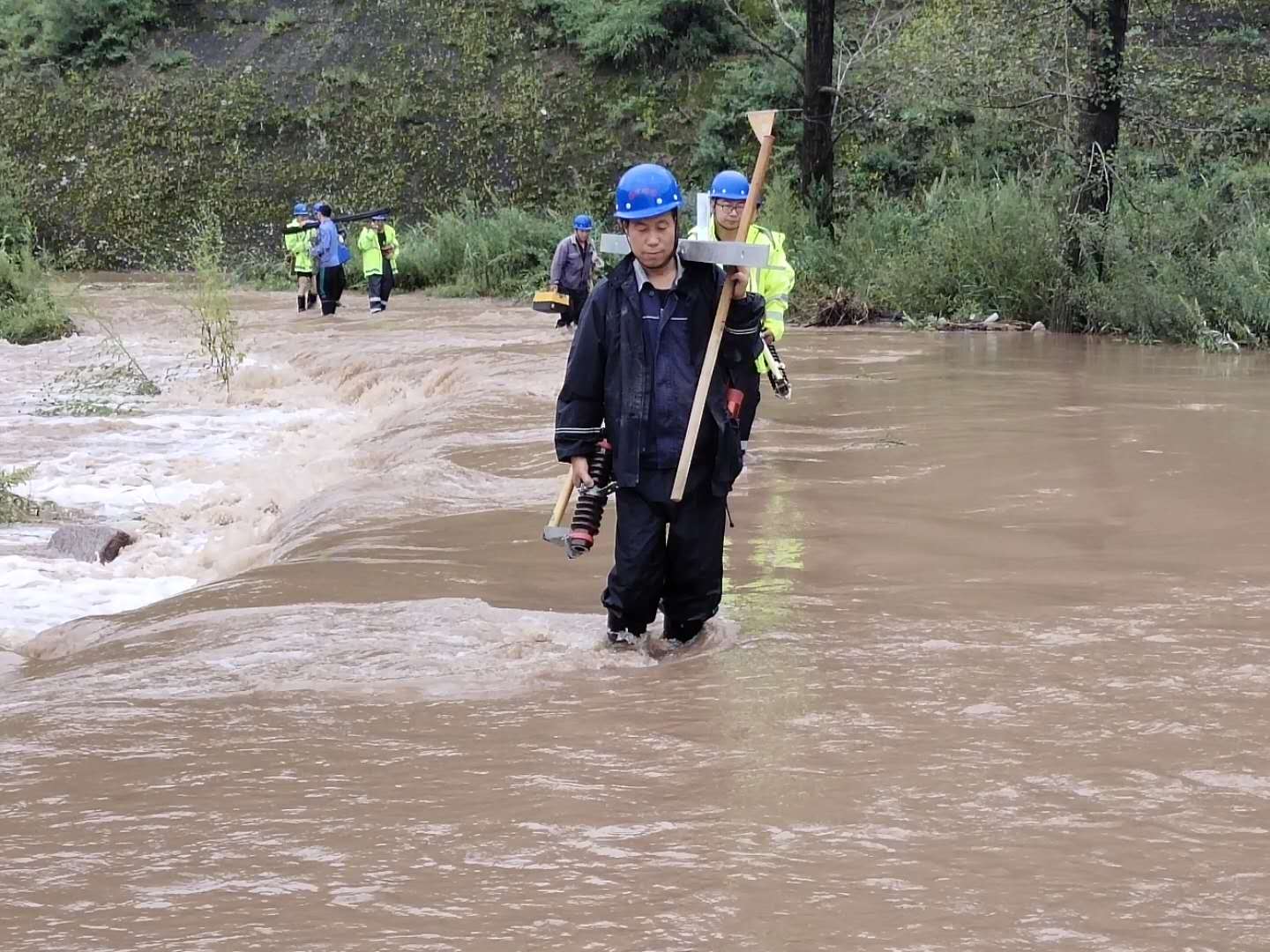 由于受損線路地處山區(qū),地形復雜,道路沖毀,大型機械難以到達現(xiàn)場,巡視搶修難度大。為快速高效搶修線路保障供水用電,搶修人員采取徒步過河。