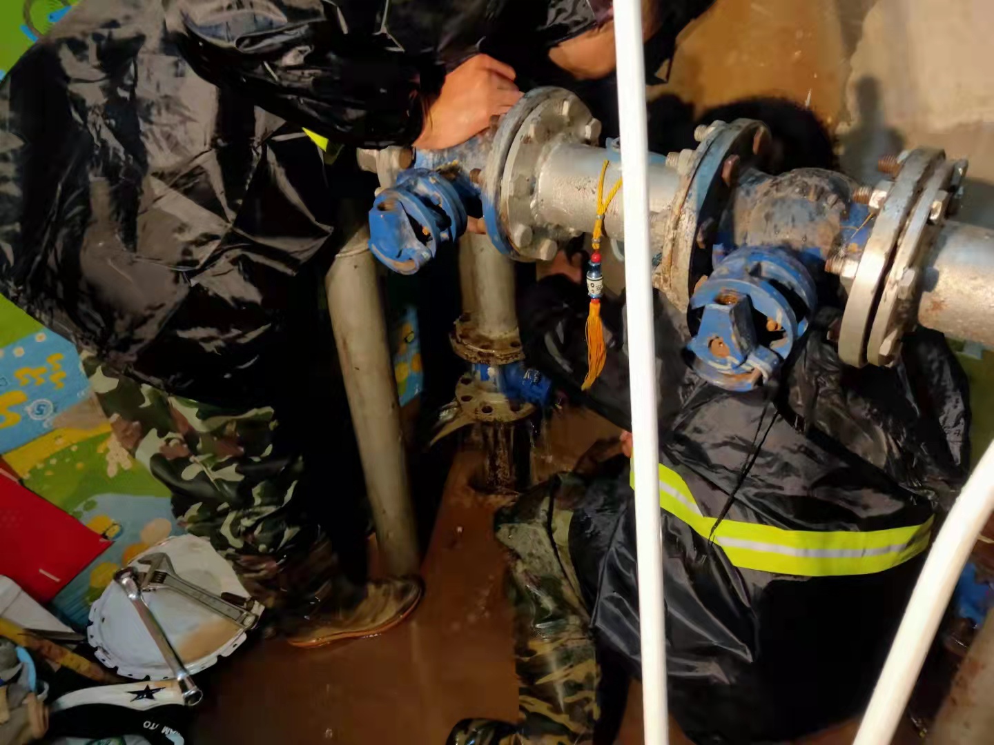 27日下午6點(diǎn),中心小區(qū)A22樓DN80半徑球閥漏水,搶修速度要快但不能影響住戶的供暖使用,搶修人員帶水更換閥門,因空間及其狹小,管道中的水像是要吞沒維修人員一樣,但他們完全顧不上擦拭,手握著冰冷的工具,一下一下的擰著,絲毫不敢松懈,額頭滾燙的汗水,身上冰冷的積水,在微弱的燈光下顯得格外耀眼。經(jīng)過8個小時的奮力搶修,于28日凌晨2點(diǎn)管道更換完畢,在場搶修人員一顆懸著的心也終于落地,但他們拖著疲憊的身子繼續(xù)工作著,還需要后續(xù)現(xiàn)場清理工作……忙碌的身影成了這個夜晚別樣的風(fēng)景。
