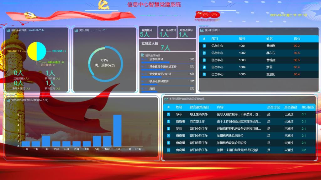 為此,該公司信息中心技術(shù)人員積極尋找解決辦法,最終通過(guò)瀏覽器錄入、查詢、展示,利用服務(wù)器儲(chǔ)存資料的模式建設(shè)管理系統(tǒng),形成了網(wǎng)頁(yè)端直接錄入資料,并利用大屏進(jìn)行資料動(dòng)態(tài)展示形成分析圖表的模式。同時(shí),在系統(tǒng)中融入按日期檢索查詢的功能,真正實(shí)現(xiàn)了信息中心黨建工作的數(shù)據(jù)維護(hù)和動(dòng)態(tài)展示,使得支部黨建工作有數(shù)據(jù)可查、有數(shù)據(jù)可看、有數(shù)據(jù)可用。