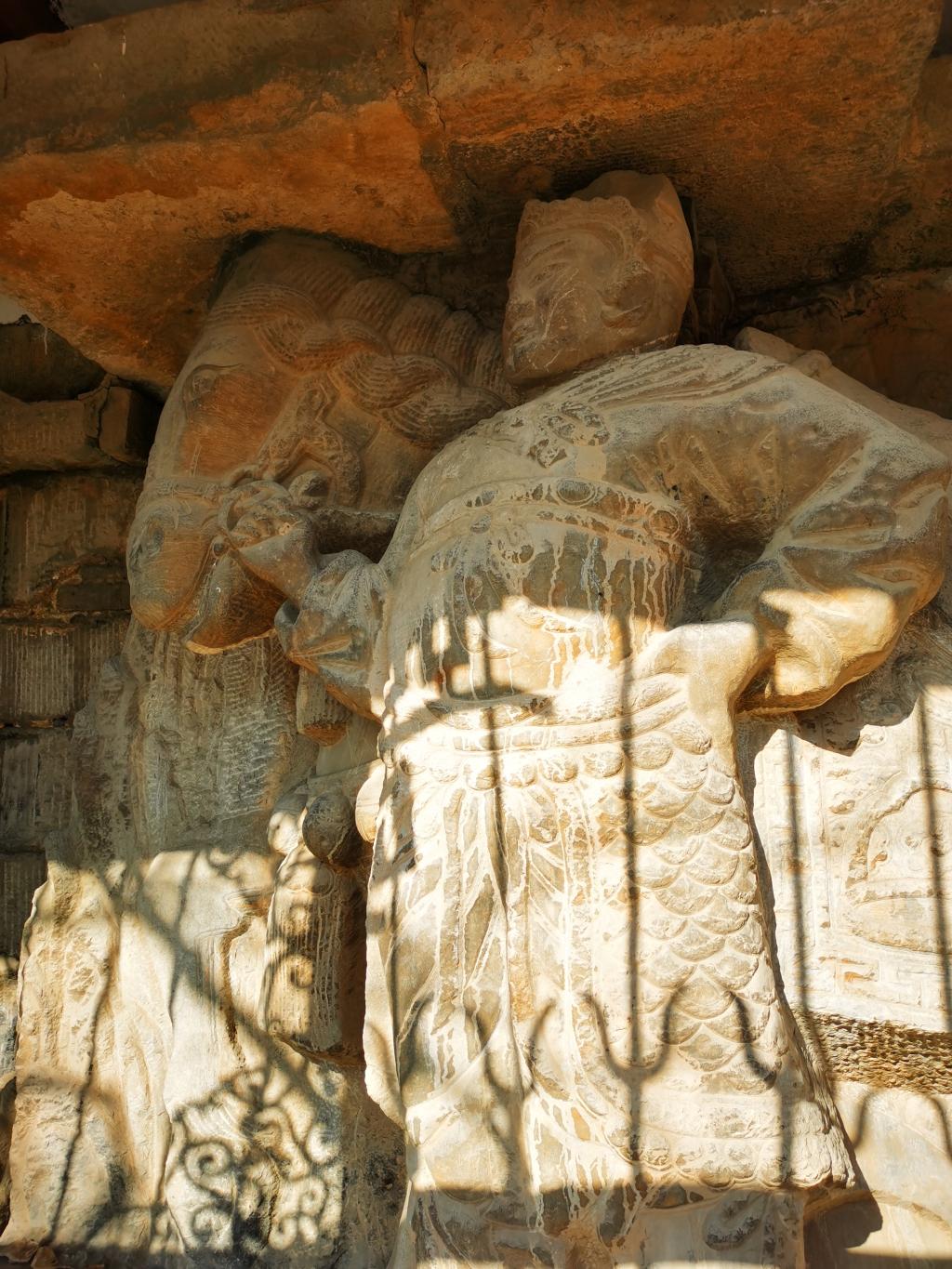 可不是么,眼前這座關(guān)帝廟僅僅是個(gè)遺址。當(dāng)年大搞生產(chǎn)運(yùn)動(dòng)時(shí),為了燒水泥修建拉石棧道,嫌山脊梁上的關(guān)帝廟礙事,竟然把廟拆了,如今崖下僅存“關(guān)平拉馬圖”石刻。歷史如煙隨風(fēng)而逝,過去的遺憾永遠(yuǎn)成為遺憾,決不能讓未來再留下這樣的遺憾。望著石刻,我和友人沉默良久……且見關(guān)平身披鎧甲,高大威猛,左手叉腰,右手牽繩,昂首挺胸,目視遠(yuǎn)方,可謂英雄氣概,威風(fēng)凜凜。我不禁扼腕嘆息道:關(guān)爺不在,平兒為誰拉馬?(孫鵬)