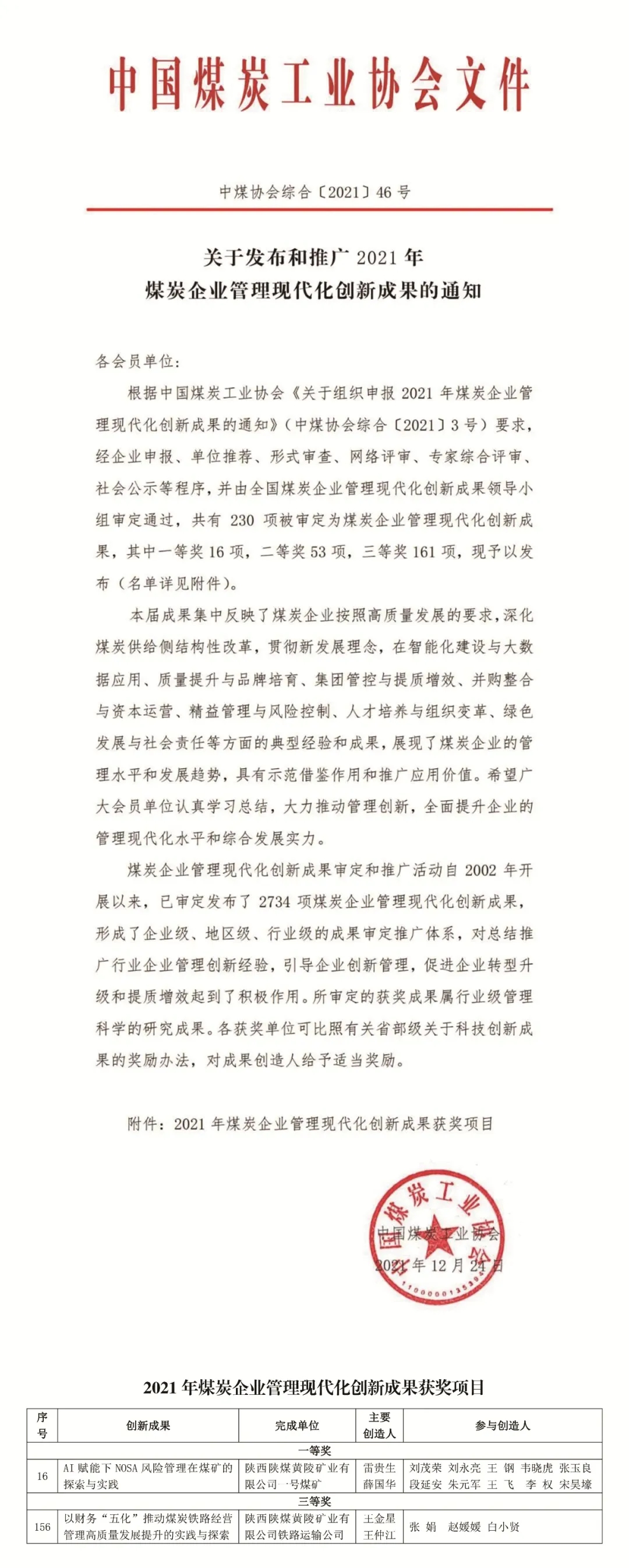 日前,中國煤炭工業(yè)協(xié)會(huì)公布了“2021年煤炭企業(yè)管理現(xiàn)代化創(chuàng)新成果”獲獎(jiǎng)名單,黃陵礦業(yè)一號煤礦管理創(chuàng)新成果《AI賦能下NOSA風(fēng)險(xiǎn)管理在煤礦的探索與實(shí)踐》榮獲一等獎(jiǎng),鐵路運(yùn)輸公司管理創(chuàng)新成果《財(cái)務(wù)“五化”推動(dòng)煤炭鐵路經(jīng)營管理高質(zhì)量發(fā)展提升的實(shí)踐與探索》榮獲三等獎(jiǎng)。