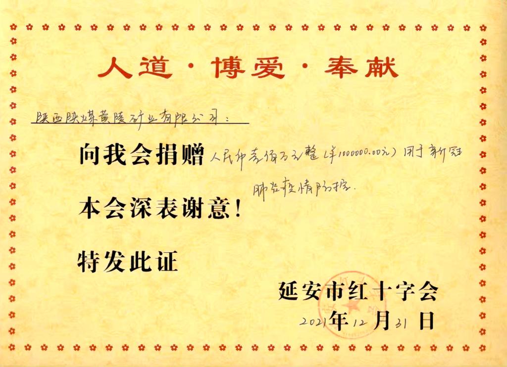 面對省內(nèi)依然嚴峻的疫情形勢,在全力抓好疫情防控各項工作的同時,黃陵礦業(yè)公司于2021年12月31日,分別向延安市紅十字會和黃陵縣紅十字會捐贈了100萬元和50萬元,支持當?shù)卣_展疫情防控工作,用實際行動踐行了國有企業(yè)無私奉獻的大愛情懷和社會擔當。