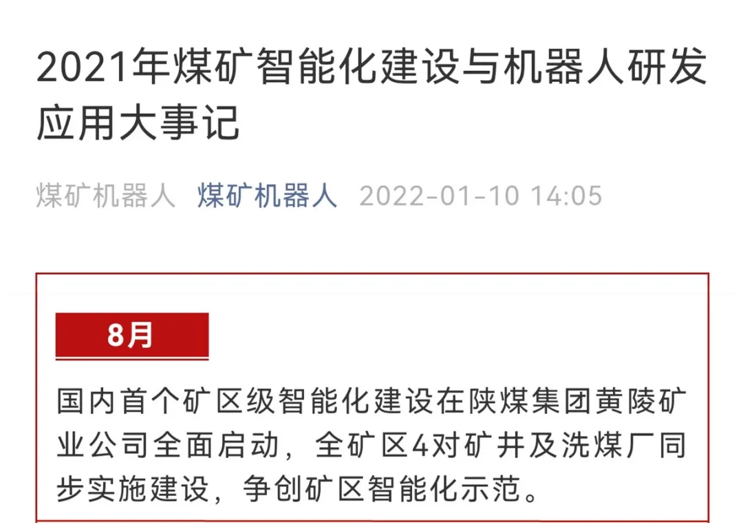 1月10日,應(yīng)急管理部信息研究院(煤炭信息研究院)發(fā)布了2021年煤礦智能化建設(shè)與機器人研發(fā)應(yīng)用大事記,公司智能化建設(shè)成功入選。