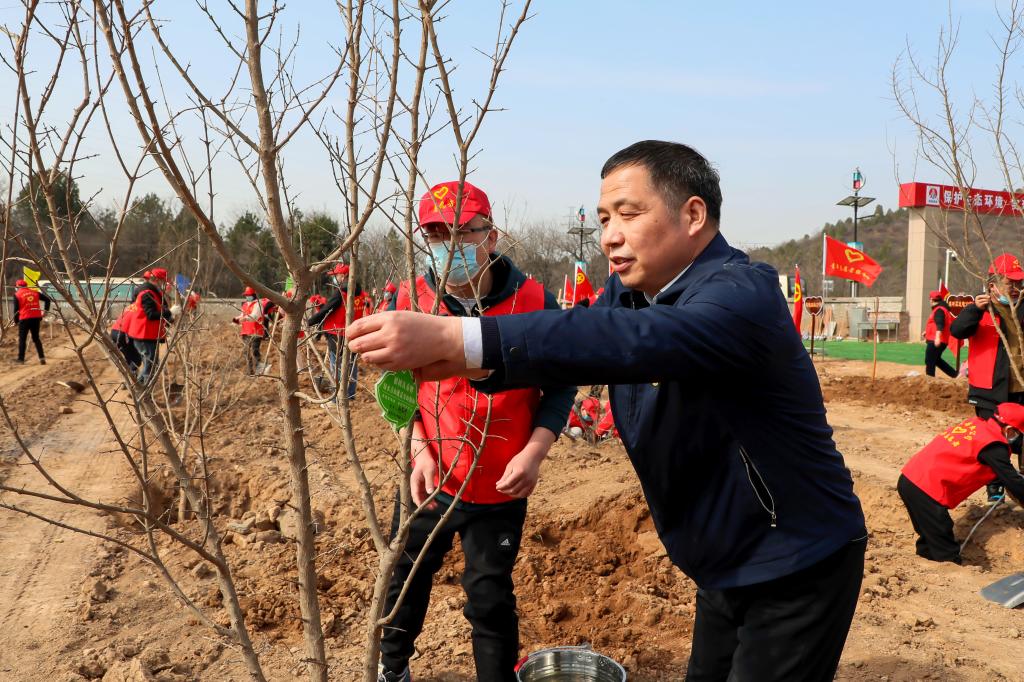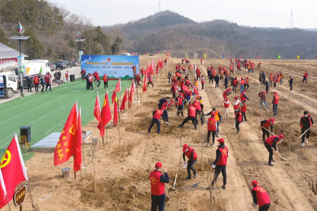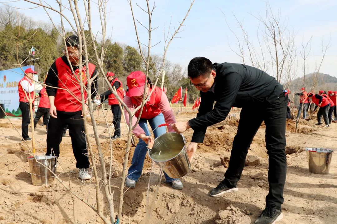 迎風(fēng)舞動(dòng)的團(tuán)旗、流動(dòng)的紅色身影,植樹現(xiàn)場(chǎng),黨員干部和青年志愿者們同心聯(lián)動(dòng),大家一起揮鍬挖坑、扶樹填土、提水澆樹,相互協(xié)作。