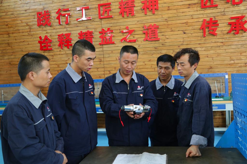 在該公司技能大師工作室,幾名職工正在討論創(chuàng)新項目的實施方案。