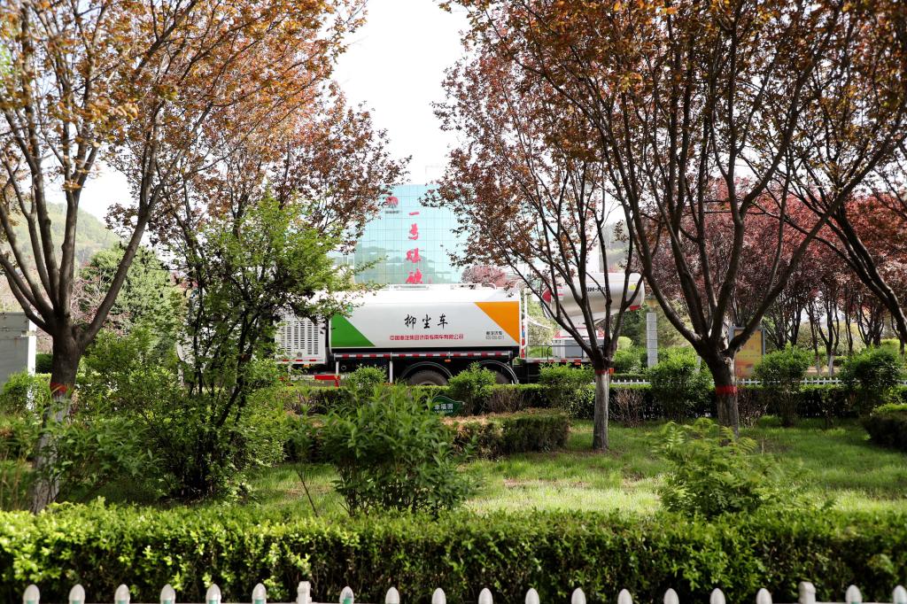 六月的清晨,氣溫宜人,早霞穿過(guò)礦區(qū)茂密的樹(shù)林,透過(guò)晨霧,從密密層層的枝葉間透射下來(lái),地上印滿銅錢(qián)般大小的光斑。剛進(jìn)入礦區(qū),一輛掃地車(chē)迎面駛來(lái),在掃地車(chē)的后面緊跟著抑塵霧炮灑水車(chē),車(chē)后留下一路干凈清爽。