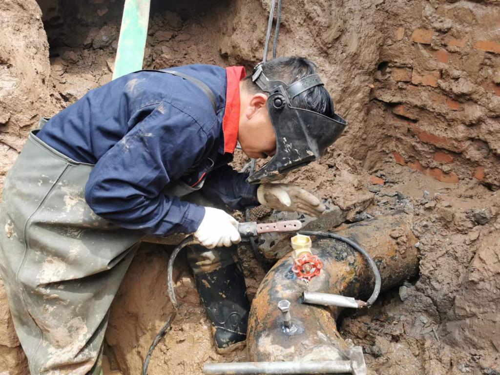 據(jù)悉,該漏水管道是因使用年限久遠(yuǎn)老化所致,通過挖掘機(jī)現(xiàn)場3小時的作業(yè),挖出土方30余方,挖至坑基3米多深處發(fā)現(xiàn)直徑200的主管道一處正冒著一大股水,坑道內(nèi)瞬間泥水混雜沒過小腿。此時主任王永紅已穿好橡膠皮連體褲,戴好護(hù)目鏡,手持焊接設(shè)備等工具很快下到管道坑內(nèi),找準(zhǔn)漏點(diǎn)位置開始專注焊接,整個操作過程嫻熟自如順利完成焊接漏點(diǎn)。