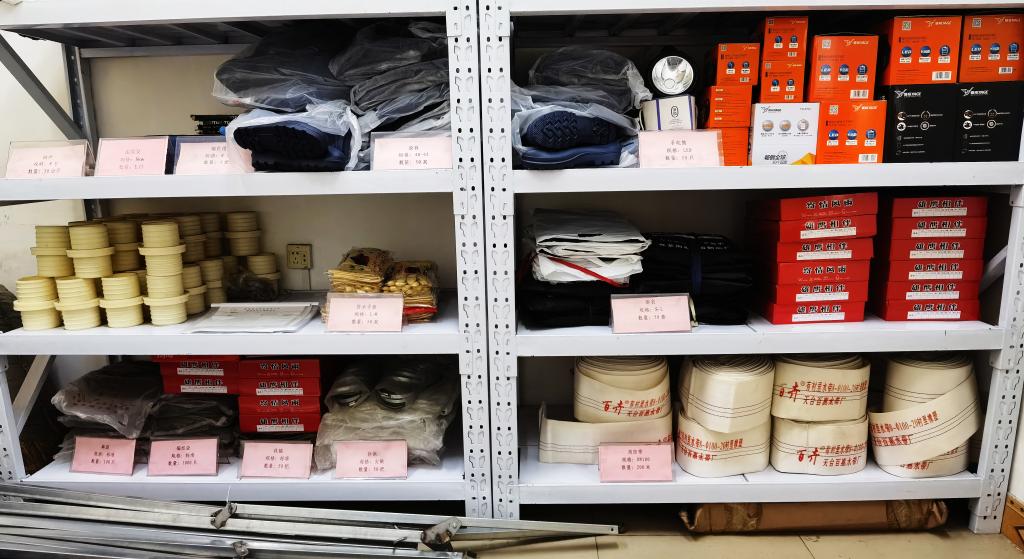 在該公司防汛物資庫房,膠靴、鐵锨、手電、雨衣等防汛物資經(jīng)過驗收合格整整齊齊的擺放在貨架上。