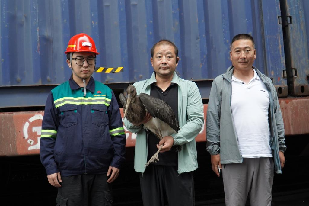 “你們快看那是什么?好像還活著,身體在動(dòng)。”裝車工賈延鵬在檢查到第15節(jié)車廂時(shí),發(fā)現(xiàn)箱內(nèi)有一只大鳥,懷疑其受傷無(wú)法起飛,急忙叫來(lái)了一旁的同事。